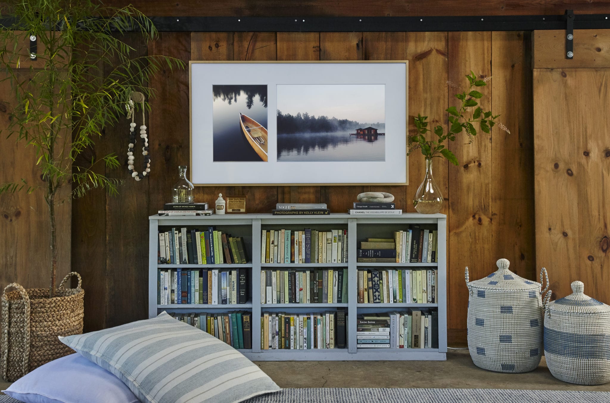 During the boathouse refresh, Samsung challenged us to incorporate their new TV, The Frame, into the space. As I mentioned, I was skeptical, but after seeing and experiencing The Frame firsthand, I’ve converted. Not only does The Frame look like art, with the ability to collage or matte your own images or feature pre-loaded photos and art to display, it sits COMPLETELY flush against the wall (like a picture frame). You can purchase different colors of Customized Frames to suit your decor, change the warmth and brightness of the artwork to fit the lighting in your space automatically with a built-in sensor, AND it comes with a handy, slim, easy to hid box for all those annoying gadgets that usually sit out on your TV console.