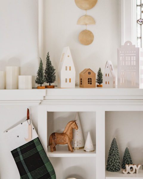 One of my favorite memories of the holidays is when my mom would set up a Christmas village in our living room. Each house was beautiful and I loved how the light flickered at night. I designed three homes for my village inspired by my travels to Scandinavia. This project is even simpler than it looks because all you need are paper and tea lights (LED ones, because safety first)! I made these out of large pieces of art paper in various shades of cream, light gray, kraft paper, and dark gray to give the village some contrast.