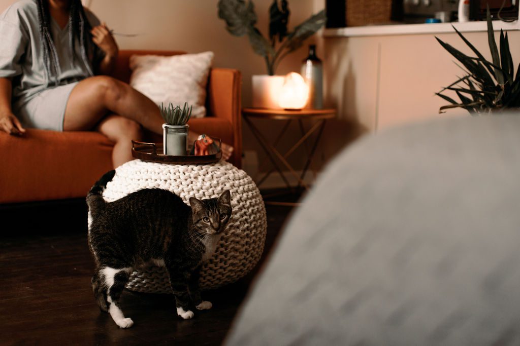 Her dark tabby cat, sporting a white bib and white paws, dances around our ankles like he has a string on his back connected to the ceiling. He rubs everything in the purest morning pleasure. “He’s a rescue. That’s the name they gave him—Crease. It’s unique, just like the crease in your pants. I worked at Ruff Start Rescue and lasted three weeks until I adopted him. He had me hooked.” She coos at him to come near her on the couch and he prances toward her.