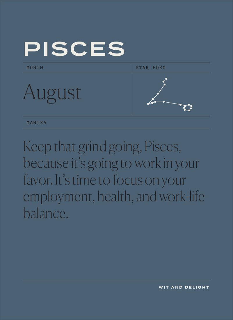 Keep that grind going, Pisces, because it’s going to work in your favor. It’s time to focus on your employment, health, and work-life balance. Are you the master of your schedule or are you noticing things are out of rhythm? When you hit August 15th, you’re likely to be feeling the need to take a break and relax. Trust the messages the Universe is telling you now. Step back if you need to. Yet, when we reach the 30th, a stunning and magical moment for commitment arrives. If you have a special someone, consider how you can grow even more. If you’re single and ready to mingle, know what you crave in a partner and go out while the stars are aligned.